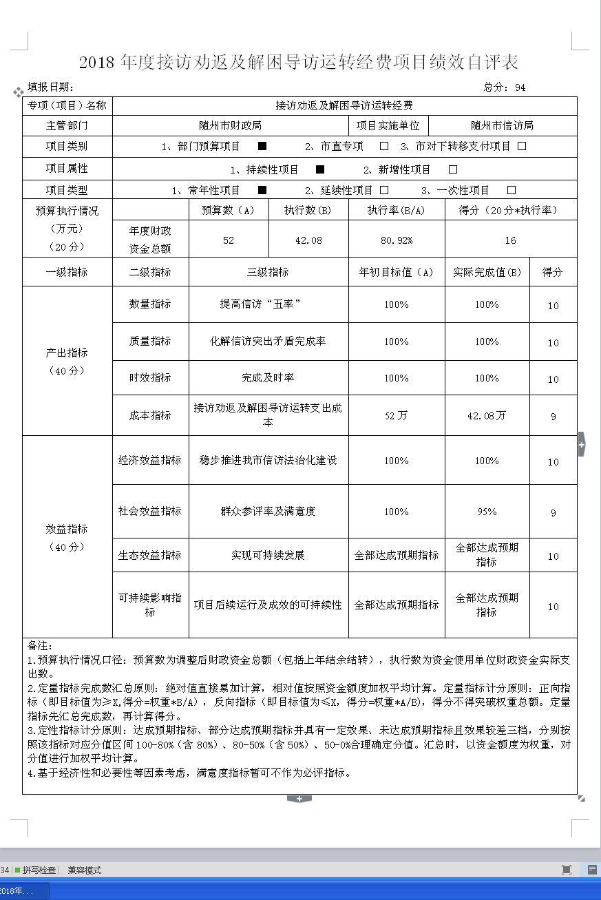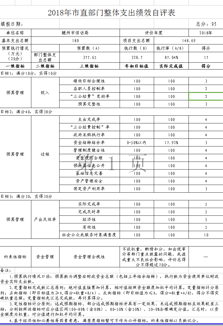 第四部分隨州市信訪局2018年度部門績效評價表