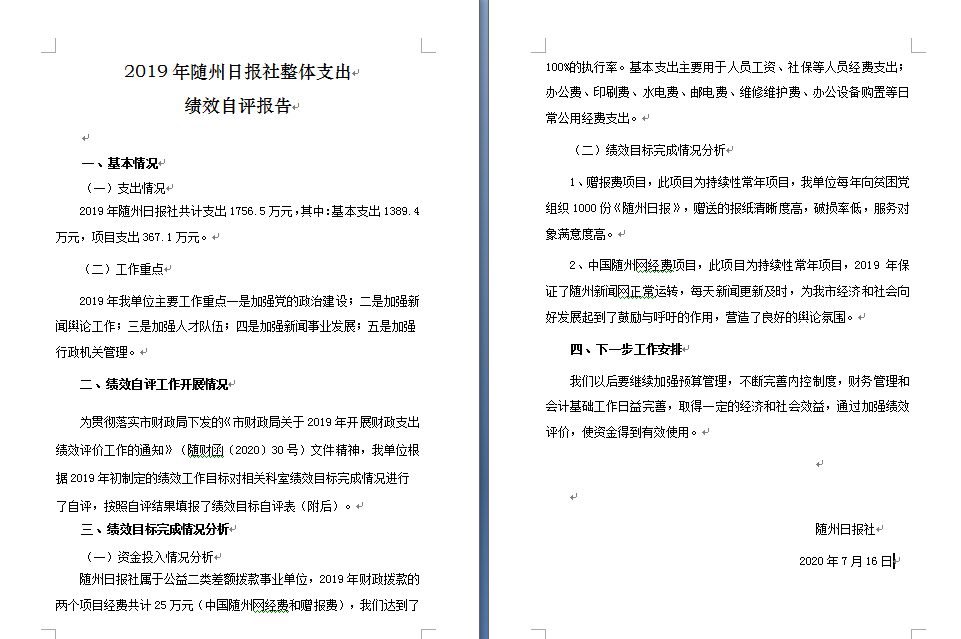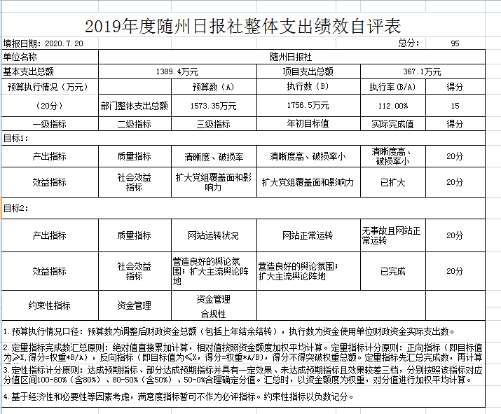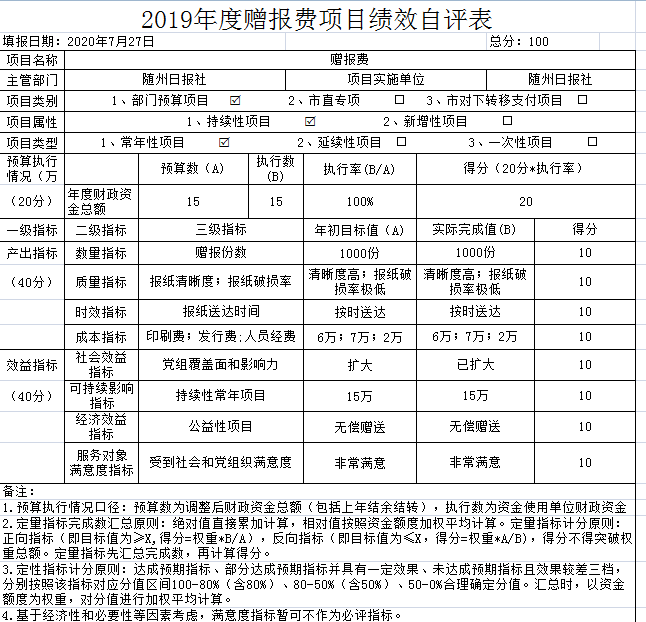我單位對兩個項目進行了績效自評,分別為中國隨州網經費和贈報費。年初預算數分別為10萬元和15萬元,全年執行數共計25萬元,完成預算的100%。項目主要效果:一是擴大了主流輿論陣地,為我市經濟和發展營造良好的輿論氛圍。二是擴大主流媒體影響力和公信力。三是更好的服務讀者、服務社會。