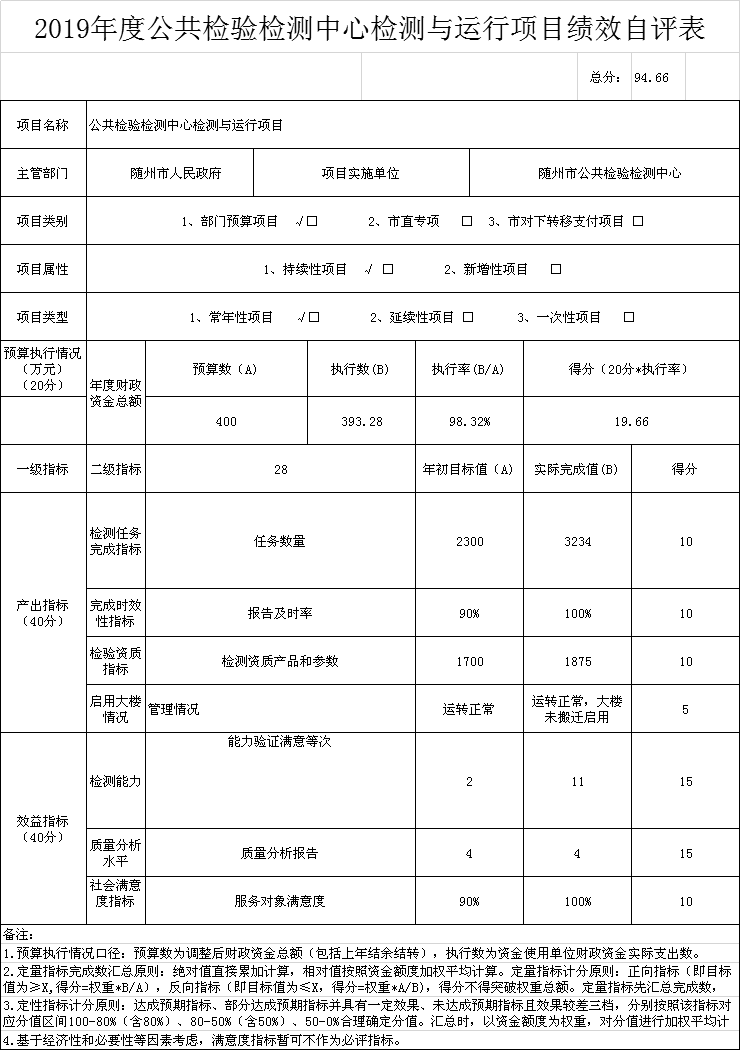我部門今年在實際部門決算中反映所有項目績效自評結果,檢測與運行項目績效自評綜述:結合本次自評結果,總分為94.66分,扣分數5.44分,主要是為產出指標中的管理情況指標完成情況:實際是單位管理運轉正常,檢測大樓未啟用,此項指標扣5分。