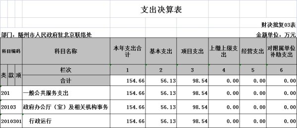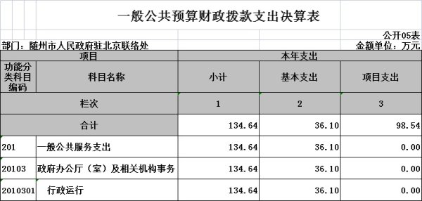 ?一般公共服務(類)行政運行(項):指市駐京聯絡處用于機關正常運轉的公務費用,包括辦公費、水費、電費、郵電費、物業管理費、差旅費、維修費、公務接待費、勞務費、工會經費、公務用車運行維護費等機關其他商品和服務支出。