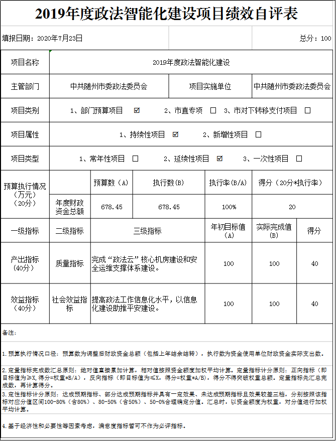 政法智能化建設項目全年預算為678.45萬元,實際執行數為678.45萬元,完成預算數100%。主要產出和效益:初步建成一張縱向貫通、橫向聯通的隨州市政法綜合信息網,建立政法數據中心和集維穩中心、綜治中心、網格中心、視頻會議、指揮調度等為一體的多功能應急指揮平臺,積極配合對接省委政法委信息系統,打造了隨州特色的政法業務支撐體系、政法為民服務支撐體系和安全運維體系,全力推動了政法機關網絡互通、資源整合、信息共享、業務協同。發現的問題和原因:項目績效指標設計需進一步加強,項目績效指標設計多為定性指標,缺乏定量指標;項目管理制度需進一步完善,具體項目支出有待科學規劃。下一步改進措施:在年度預算績效申報時將年度工作任務細化分解為具體的工作目標,采取定量的方式制定清晰、可衡量的績效指標,并通過完善制度管理來協調項目建設,保證項目長遠目標的貫徹執行和預定目標的實現。