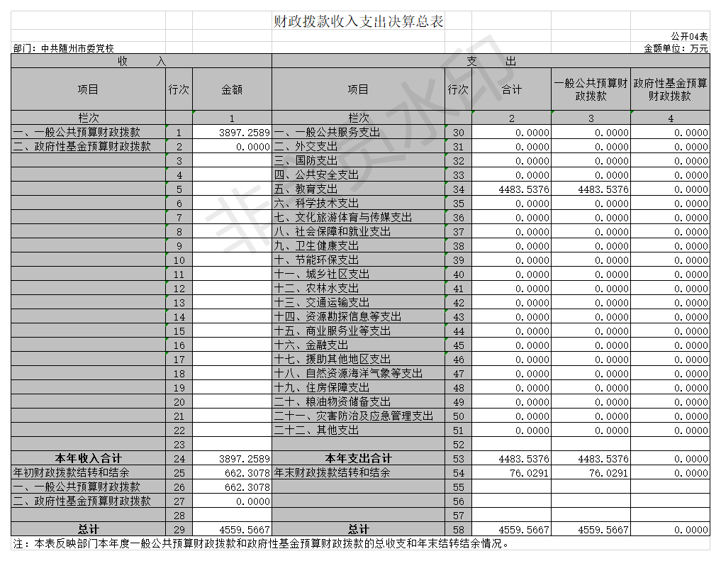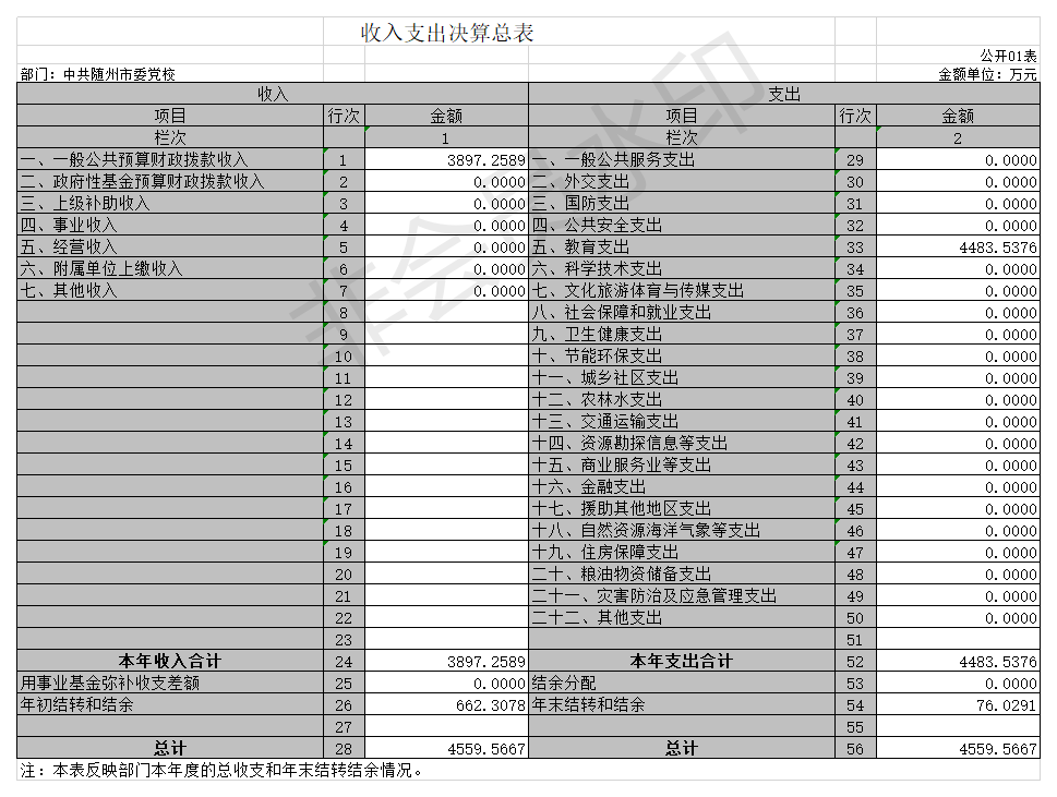 市委黨校2019年決算總收入3897.26萬元,比上年度增加997.67萬元,增加了34.41%,主要是項目經費增加了,“新校區設備購置費”增多,新增“新校園后勤服務外包費”。決算總收入全部都是一般公共預算財政撥款收入。
