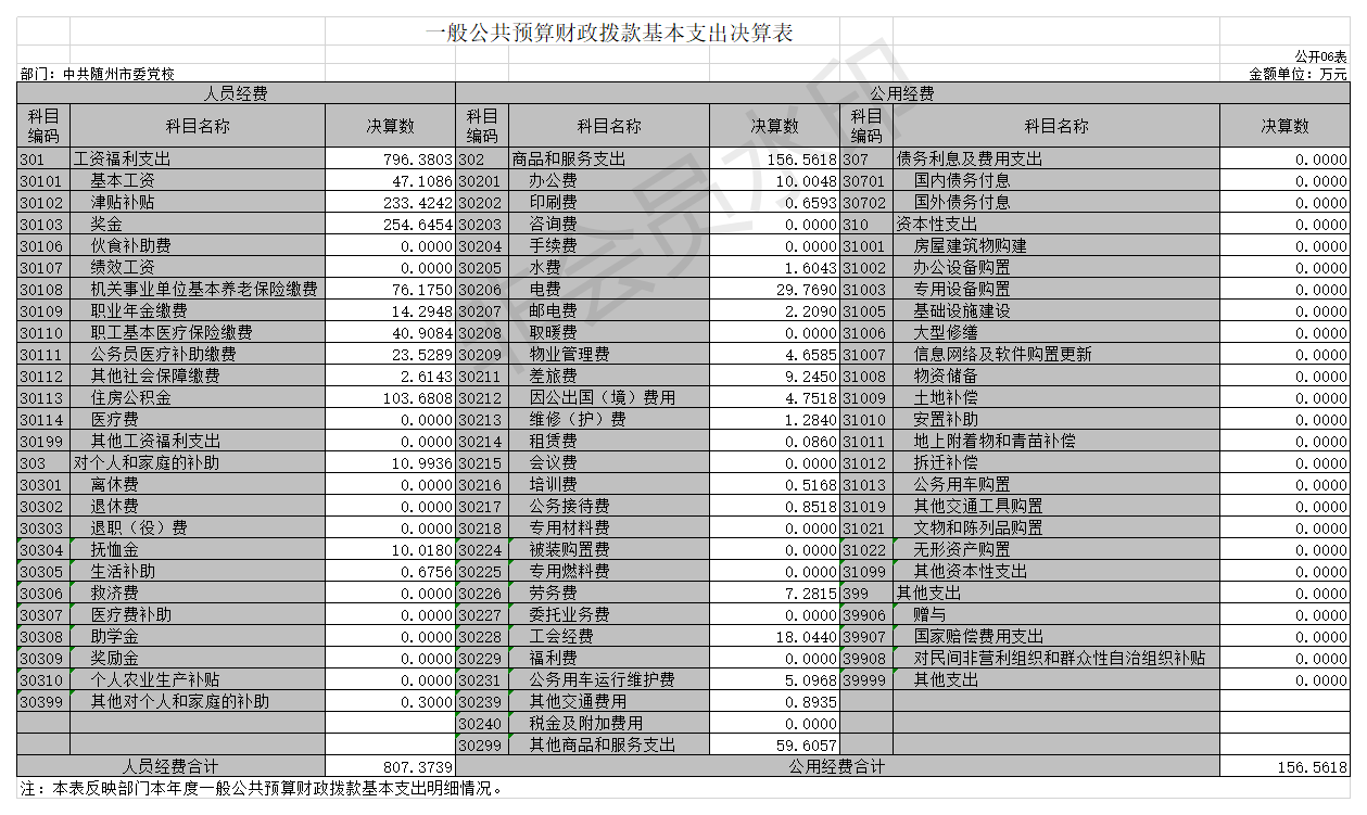 隨州市委黨校是全額撥款的參照公務員法管理事業單位,內設辦公室、基層黨校科、政工科、理論教研室、黨性教研室、市情研究室、教務科、學員組織科、公務員培訓科、總務科、網絡管理科、曾都分校12個科室,無下設二級單位。2019年末,單位編制50名事業編,3名“以錢養事“編制”,在職人員48人,較上年度在職人員41人,增加7人,變動情況為2名教師辭職,9名區委黨校人員劃入市委黨校