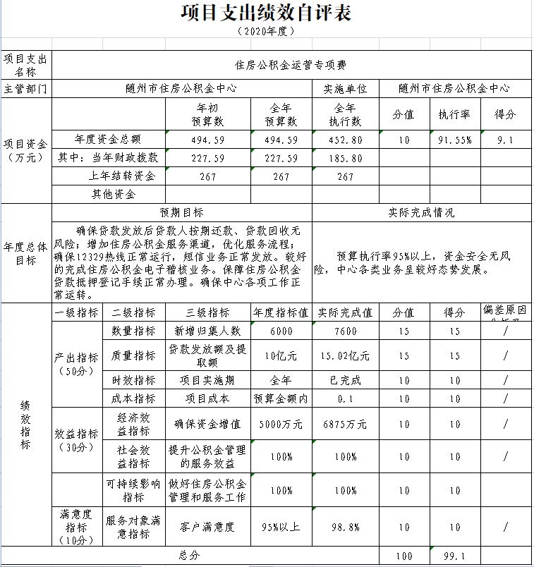 項目全年預算數為494.59萬元?,執行數為452.80萬元?,完成預算?91.55 %?。主要產出和效益?:一是全市住房公積金新增擴面7573人,完成省住建廳下達年度擴面任務2000人的378.65%,完成市政府下達年度擴面任務6000人的126.22%;新增建制單位171家,完成市政府年度單位擴面任務100家的171%;二是新增歸集13.46億元,完成省住建廳下達年度歸集額任務9.5億元的141.63%,完成市政府下達年度歸集額任務10億元的134.6%;三是辦理住房公積金提取7.47億元,完成市政府下達年度提取任務5億元的149.32%;四是發放住房公積金貸款7.55億元,完成省住建廳下達年度貸款任務6億元的125.85%,完成市政府下達年度貸款任務7億元的107.87%;個貸率85.43%,達到80%以上;五是逾期率0.69‰,低于省住建廳公積金貸款逾期率0.8‰控制目標;六是實現住房公積金增值收益6875萬元,完成省住建廳下達年度任務3500萬元的196.43%,完成市政府下達年度任務5000萬元的137.5%。