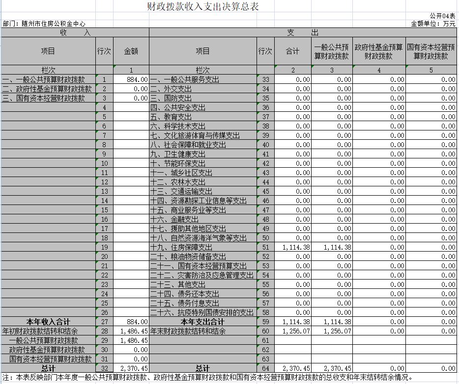 2020年收入總計2370.45萬元,全部是財政撥款收入,其中:本年收入合計884萬元,年初結轉和結余1486.45萬元。