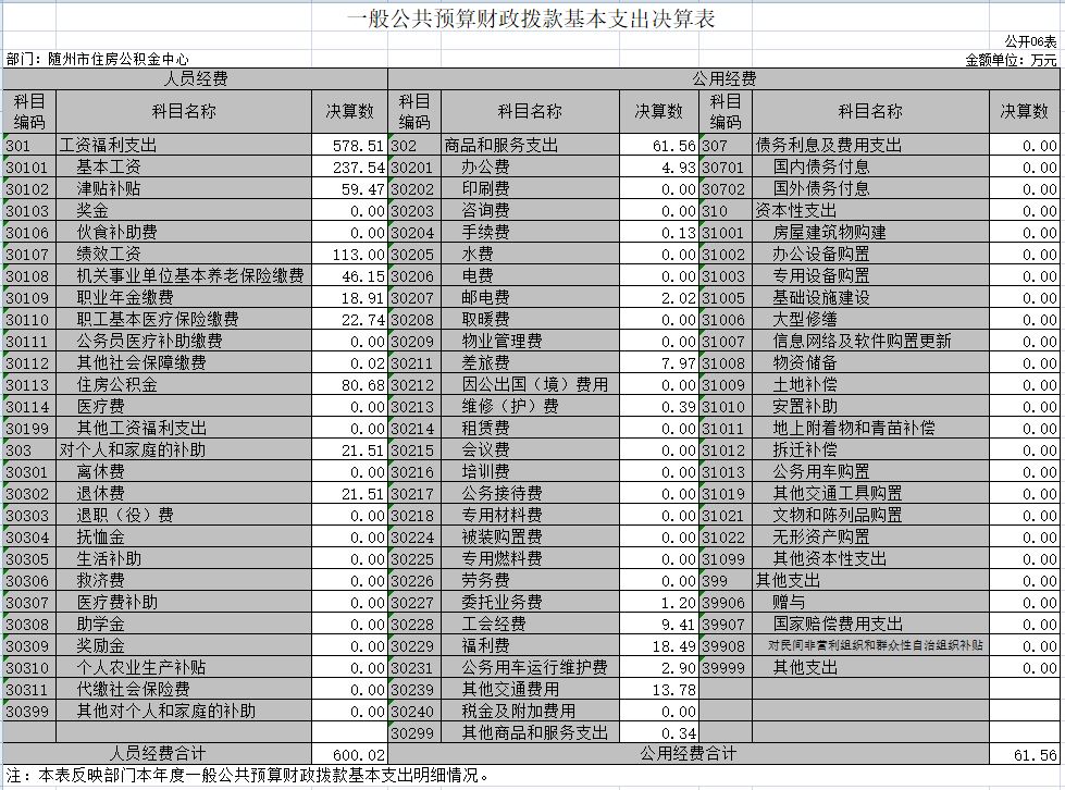 隨州市住房公積金中心為隨州市人民政府不以營利為目的的公益二類正處級事業單位,內設綜合科、財務會計科、歸集執法科、貸款管理科、內審稽核科、信息管理科、中心營業部、廣水辦事處和隨縣辦事處。年末實有人數45人,其中在職人員39?人,退休人員6人。