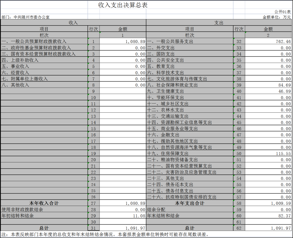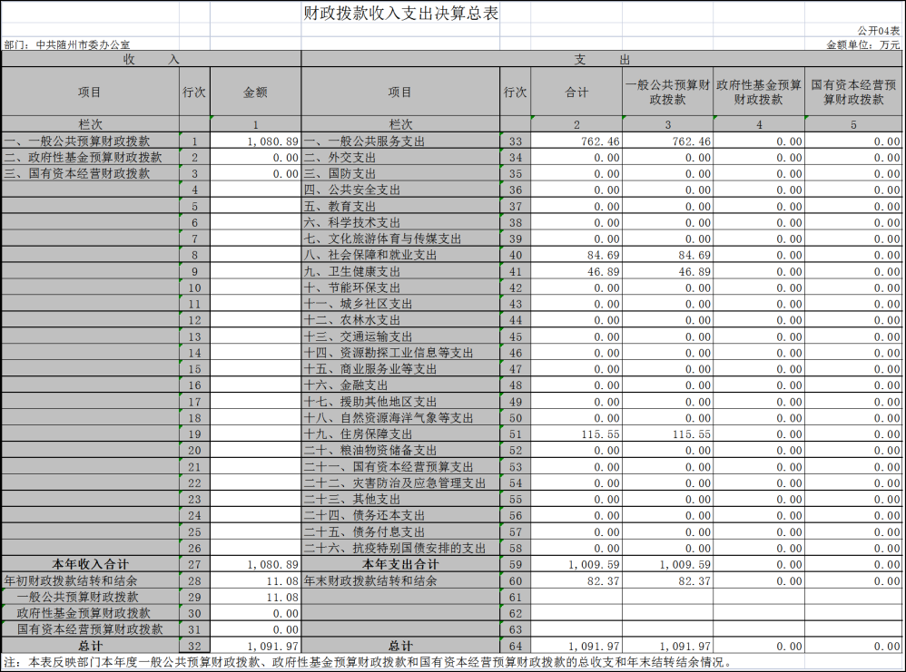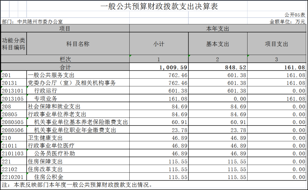 市委辦2020年度財政撥款收入預算為844.47萬元,實際收到的一般公共預算財政撥款收入為1091.97萬元(追補的為審核撥付的獎勵性工資及召開的市委全會和全市抗疫表彰大會等會議費);財政部門撥款對賬單1091.97萬元,無差額 。全年財政撥款支出1009.59萬元,比上年的總支出995.67萬元增加13.92萬元,主要用于更新公務用車等。