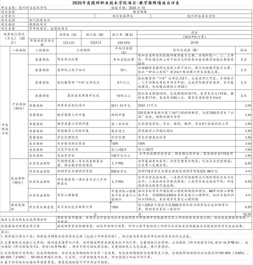 根據(jù)預(yù)算績(jī)效管理要求,我單位組織人員對(duì)2020年度一般公共預(yù)算項(xiàng)目支出全面開展績(jī)效自評(píng),共涉及項(xiàng)目2個(gè),資金107萬(wàn)元,占一般公共預(yù)算項(xiàng)目支出總額的100%。經(jīng)評(píng)價(jià),項(xiàng)目支出自評(píng)平均得分98分,后勤保障、教學(xué)保障項(xiàng)目正常開展實(shí)施,資金按規(guī)定用途使用。