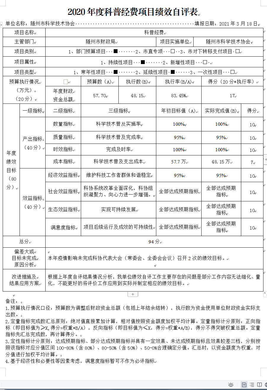 部門項目績效自評綜述:項目全年預算數為57.70萬元,執行數為48.15萬元,完成預算55.38%。主要產出和效益:一是科學技術普及實施率達95%,;二是維護科技工作者群體和諧穩定。發現的問題及原因:一是項目預算的準確性不高,二是部門支出財務管理不規范;下一步改進措施:一是要求強化項目管理,二是強化預算執行,三是嚴格執行中央八項規定和省委省政府十項規定精神。