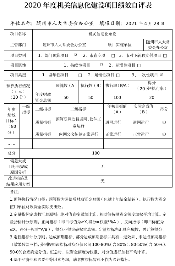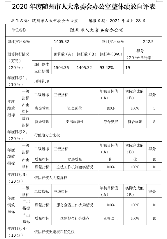 (一)預(yù)算績效管理工作開展情況。根據(jù)預(yù)算績效管理要求,本單位組織對2020年度一般公共預(yù)算項目支出全面開展績效自評,共涉及項目6個,資金242.5萬元,占一般公共預(yù)算項目支出總額的100%。從評價情況來看,本單位明確了經(jīng)費審批權(quán)限及程序,經(jīng)費預(yù)算管理、財務(wù)經(jīng)費管理、資產(chǎn)購置與處置、財務(wù)監(jiān)督等,針對“三公”經(jīng)費建立了公用經(jīng)費標準定額體系,開展公用經(jīng)費使用監(jiān)督和績效評估,進一步落實厲行節(jié)約的各項規(guī)定,確保“三公經(jīng)費”使用合理合規(guī)。自評為99分。