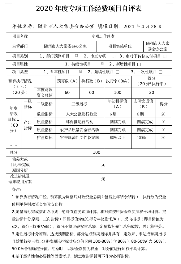 ????1、人大專項工作經(jīng)費預(yù)算60萬,實際支出60萬。主要用于主要用于保障人大公報經(jīng)費、離退休經(jīng)費、工作評議及議案辦理經(jīng)費、環(huán)保世紀行、農(nóng)產(chǎn)品質(zhì)量安全荊楚行、規(guī)范性文件備案審查、預(yù)算審查監(jiān)督咨詢及績效管理等。該項目執(zhí)行率達到100%。