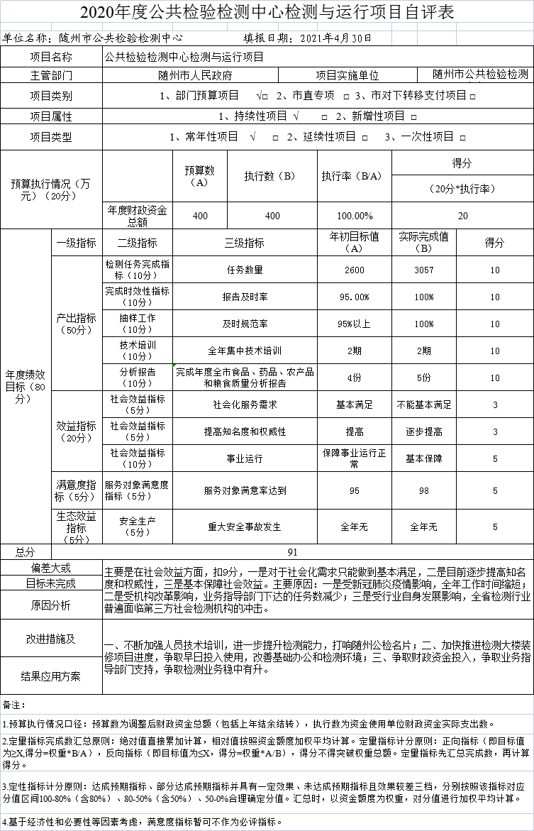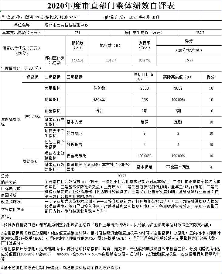 《2020年度隨州市公共檢驗檢測中心整體績效自評表》