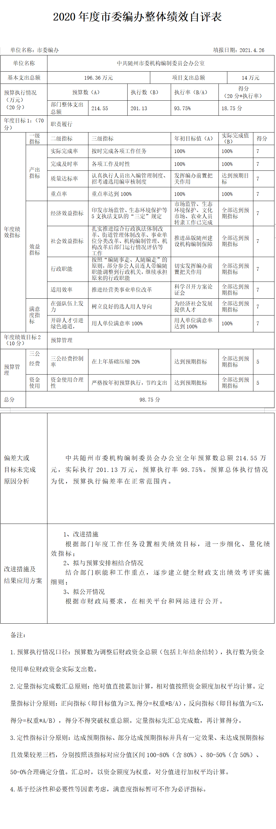 根據預算績效管理要求,我單位組織對2020年度市本級預算部門的整體支出進行績效自評,共涉及項目1個,資金14萬元,占一般公共預算項目支出總額的6.96%,從評價情況來看,中共隨州市委機構編制委員會辦公室總體情況良好,預算編制質量較好,預算信息公開符合要求;預算執行進度良好。
