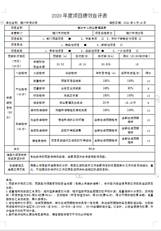 本年接訪勸返及解困導(dǎo)訪運轉(zhuǎn)經(jīng)費項目、中心大樓物業(yè)管理經(jīng)費項目均按照年初預(yù)算批復(fù)的項目文本中用途使用,確保財政項目資金合理合規(guī)用到實處。接訪勸返及解困導(dǎo)訪運轉(zhuǎn)經(jīng)費項目從產(chǎn)出指標(biāo)完成情況分析:一是信訪總量降幅達7.57%,二是化解信訪積案,極大地緩解了信訪上行壓力,三是全市領(lǐng)導(dǎo)干部包案化解信訪事項120件。中心大樓物業(yè)管理經(jīng)費項目從產(chǎn)出指標(biāo)完成情況分析:嚴(yán)格節(jié)約用水用電,物業(yè)服務(wù)安全到位,保證中心大樓全年正常運轉(zhuǎn)。下一步仍需改進:一是合理、科學(xué)地編制部門預(yù)算,二是進一步細化、量化績效指標(biāo),三是清晰反映項目的實際支出。
