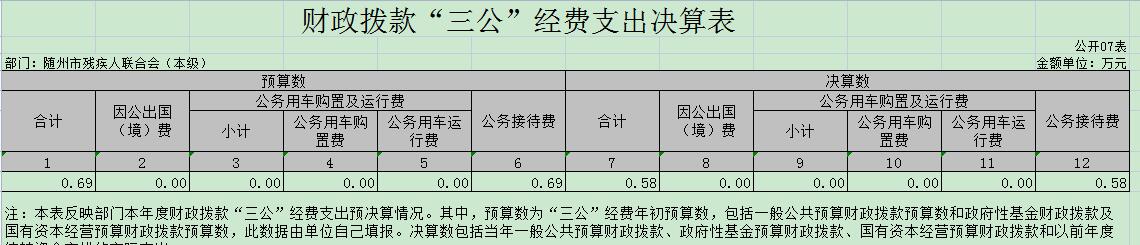 ????2020年財政撥款安排?0.69萬元,其中因公出國(境)費0萬元,公務接待費0.69萬元,公務用車購置費0元,公車運行維護費0萬元。2020年,由于嚴格控制三公總量支出,效果明顯,使支出與預算為平值,所以實際支出決算數為0.58萬元(包括公務接待費0.58萬元,全年公務接待共,12批次72人,公務車運行維護0萬元,因公出國(境)費用為0元,因沒有人員出國(境)所以沒有產生費用,我會沒有公務車,且本年度未購置新車,所以購置費為0元。