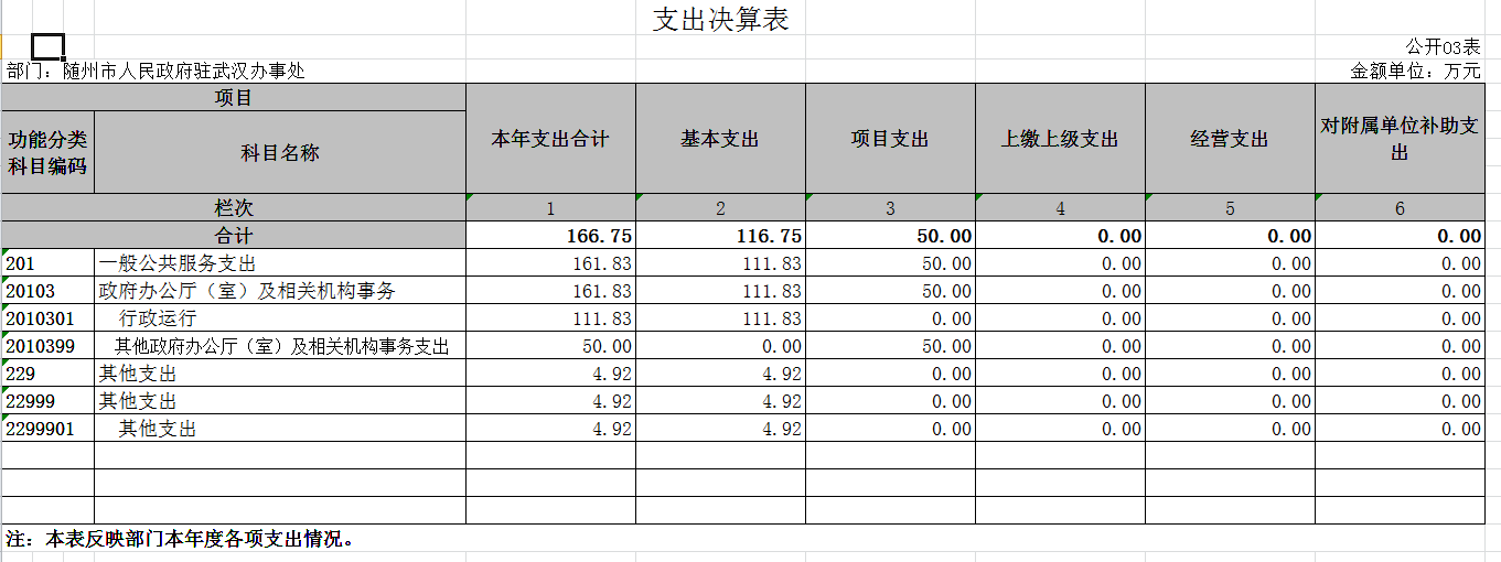 一般公共服務(類)行政運行(項):指市駐辦事處用于機關正常運轉的公務費用,包括辦公費、水費、電費、郵電費、物業管理費、差旅費、維修費、公務接待費、勞務費、工會經費、公務用車運行維護費等機關其他商品和服務支出。