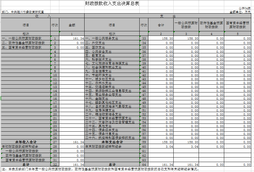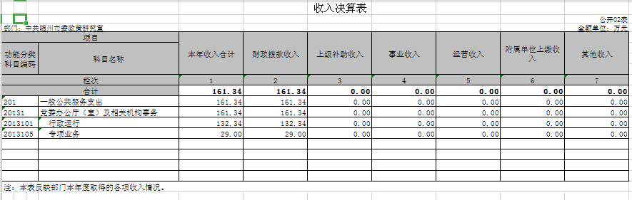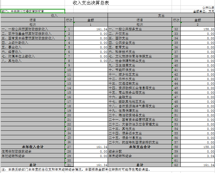 本年收入總計161.34萬元,其中財政撥款(補助)收入161.34萬元,其他收入0萬元,上年結(jié)轉(zhuǎn)0萬元。
