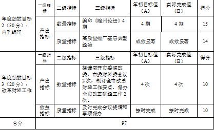 主要產(chǎn)出和效益:一是文稿服務(wù)量、調(diào)研報告數(shù)100多篇;二是編印《隨州論壇》4期;三是提請召開市委深改委、市委財經(jīng)委會議2次,制訂全市改革財經(jīng)工作要點,督辦全市改革財經(jīng)工作2次。
