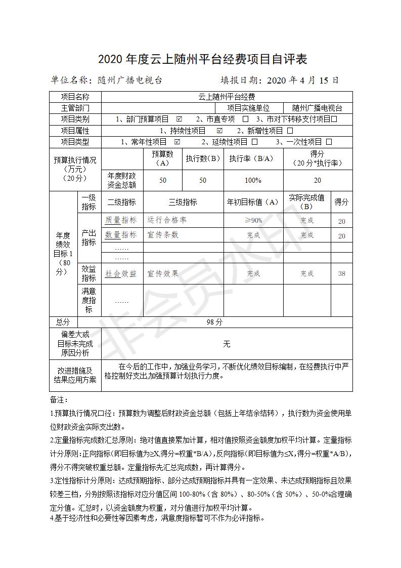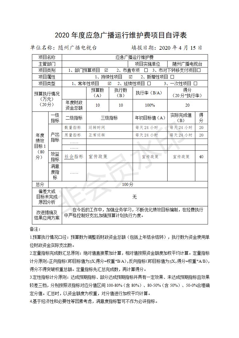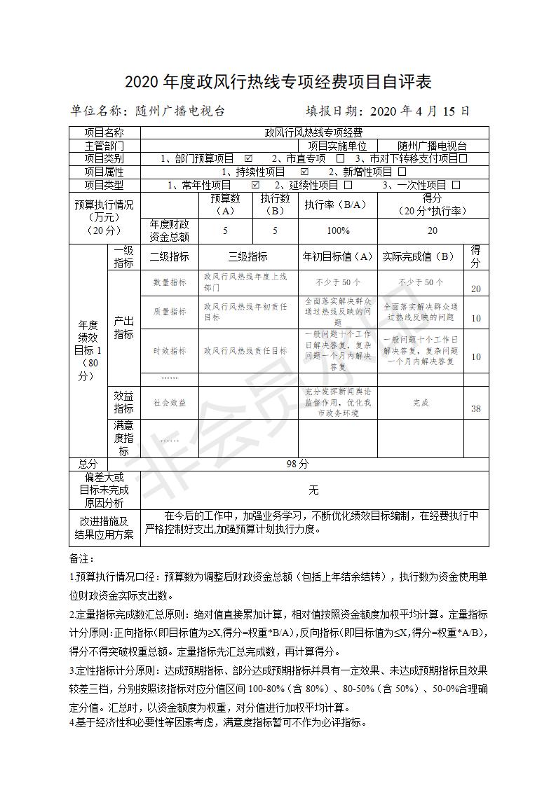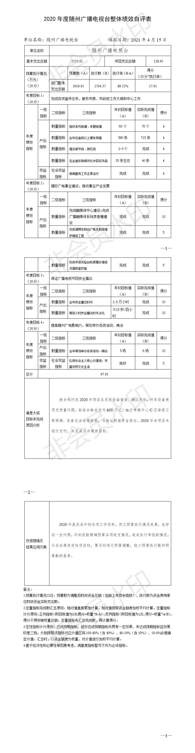 根據預算績效管理要求,隨州廣播電視臺組織對2020年度一般公共預算項目支出全面開展績效自評,項目預算安排資金合計749萬元,由于傳媒中心C區裝修進度停滯,設備無法進場安裝,導致傳媒中心廣電設備資金650萬元項目未執行,該筆經費預算未下達指標,此次績效自評共涉及4個項目,資金99萬元,占一般公共預算項目支出總額的13.22%。從評價情況來看,項目經費管理規范,資金均按規定用途使用,各項目績效目標基本完成,項目立項程序完整、規范,績效目標明確,社會效益較好,項目可持續性強,資金撥付審批程序嚴格,使用規范,投入有保障,會計核算真實準確。