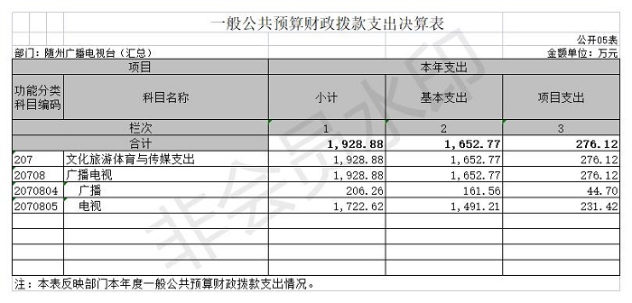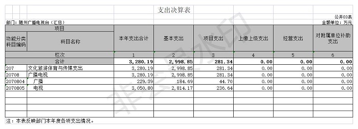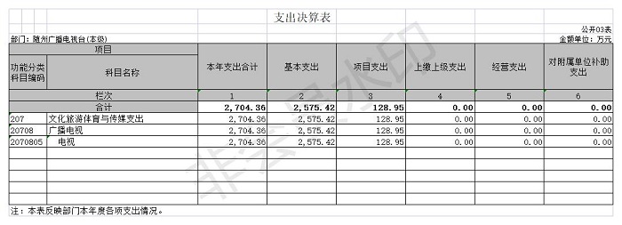 隨州廣播電視臺(本級)2020年度支出合計2704.36萬元,較上年(3145.31萬元)減少440.95萬元,減少14.02%,主要是2020年度傳媒中心廣電設備資金因裝修工程進度滯后,設備無法進場導致未進行支付,與2020年預算(3019.91萬元)相比減少315.55萬元,原因是傳媒中心演播區域裝修進度滯后,設備無法進場導致未進行支付廣電設備預算資金。其中基本支出2575.42萬元,項目支出128.95萬元。