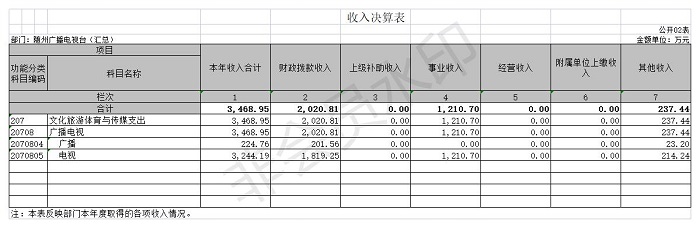 隨州廣播電視臺系統匯總2020年度收入合計3529.86萬元[較2019年度決算收入(4239.29萬元)減少709.43萬元,減少了16.73%,原因是2020年減少了省級專項資金190.59萬元,且2019年度決算收入中含年初結轉和結余516.2萬元。與2020年度預算收入合計(3793.26萬元)相比減少了263.4萬元,減少了6.94%]。其中財政撥款2020.81萬元,較2019年(2043.97萬元)減少了23.16萬元,主要原因是減少了傳媒中心廣電設備資金;事業收入1210.7萬元;其他收入237.44萬元;上年結轉60.91萬元。