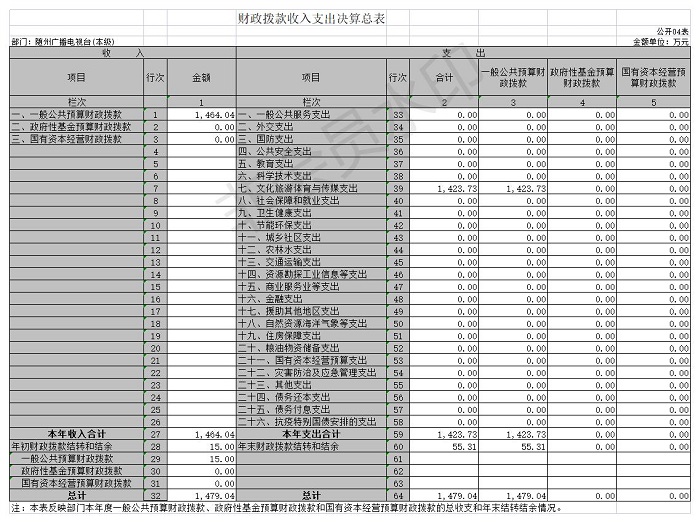 隨州廣播電視臺(本級)2020年收入合計2874.45萬元[較2019年(3173.38萬元)減少298.93萬元,減少9.42%,主要原因是減少了省級專項資金190.59萬元,事業收入減少100.93萬元,和2020年預算(3019.91萬元)相比減少了145.46萬元,減少4.82%]。其中財政撥款1464.04萬元,較2019年(1463.65萬元)增加了0.39萬元,增加原因是將省級專項資金計入財政撥款,事業收入1210.7萬元,其他收入171.63萬元;上年結轉28.08萬元。