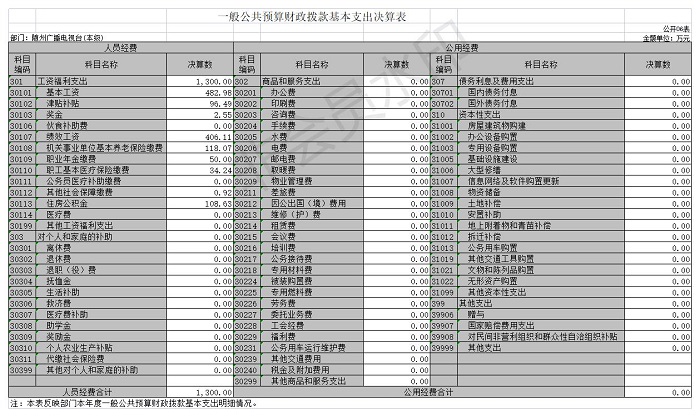 本系統納入部門預算管理的單位有隨州廣播電視臺、隨州市電視調頻發射臺、隨州市中波實驗臺三個單位。隨州廣播電視臺設辦公室、總編室、人力資源部、計劃財務部、新聞中心、節目中心、技術播控中心、應急廣播中心、大型活動中心、新媒體中心、外宣通聯部、廣告運營中心、廣播新聞綜合頻率、廣播交通經濟頻率、電視新聞綜合頻道、電視農村頻道、電視都市頻道17個內設機構,隨州廣播電視臺編制人數158名。截至2020年底,隨州廣播電視臺實有人數153人,一般公共預算財政撥款(補助)119人,其它人員24人,退休35人。