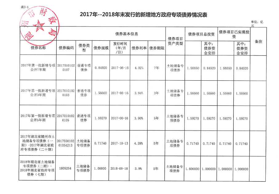 2017年-2018年末發(fā)行的新增地方政府專項(xiàng)債券情況表