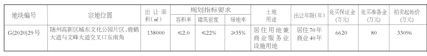 根據《中華人民共和國土地管理法》、《中華人民共和國城市房地產管理法》和《招標拍賣掛牌出讓國有建設用地使用權規定》等有關規定,經隨州市人民政府批準,隨州市自然資源和規劃局公開拍賣出讓隨州市G(2020)29號(原隨州市G(2017)66號地塊)國有建設用地使用權,具體實施由隨州市土地收購儲備中心和湖北恒源拍賣有限公司聯合承辦,現就有關事項公告如下: