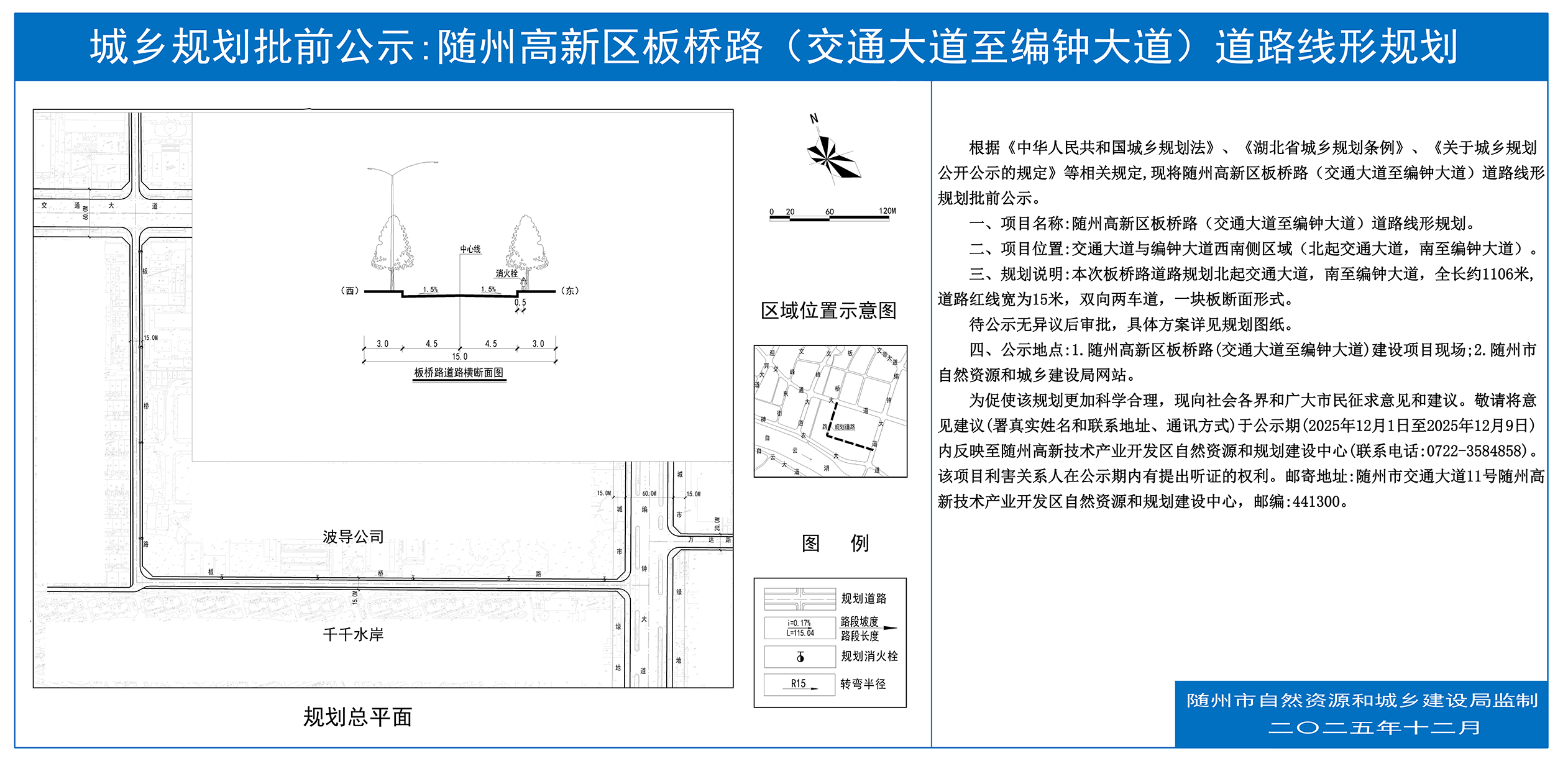 城鄉規劃批前公示:隨州高新區板橋路(交通大道至編鐘大道)道路線形規劃