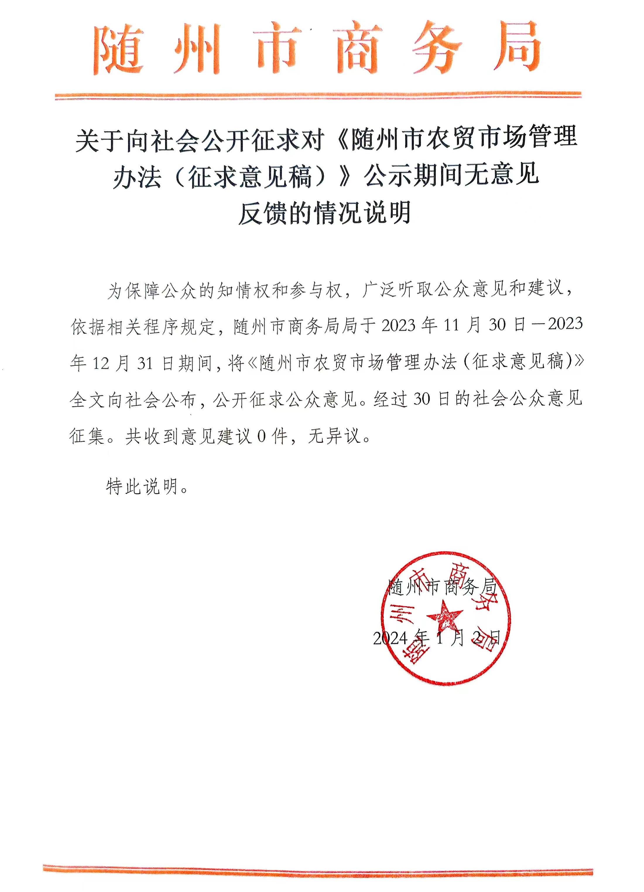 關(guān)于向社會(huì)公開(kāi)征求對(duì)《隨州市農(nóng)貿(mào)市場(chǎng)管理辦法(征求意見(jiàn)稿)》公示期間無(wú)意間反饋的情況說(shuō)明