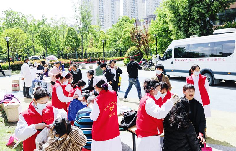 曾都區(qū)涢水街道推動社區(qū)志愿服務(wù)活動常態(tài)化,發(fā)揮志愿服務(wù)在構(gòu)建和諧文明社區(qū)中的積極作用。近日,該街道在涢水社區(qū)舉行“公益集市進社區(qū)”活動,開展家電維修、防詐騙知識宣傳、義診等志愿活動。圖為市中醫(yī)醫(yī)院醫(yī)護人員為涢水社區(qū)居民義診。