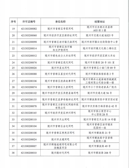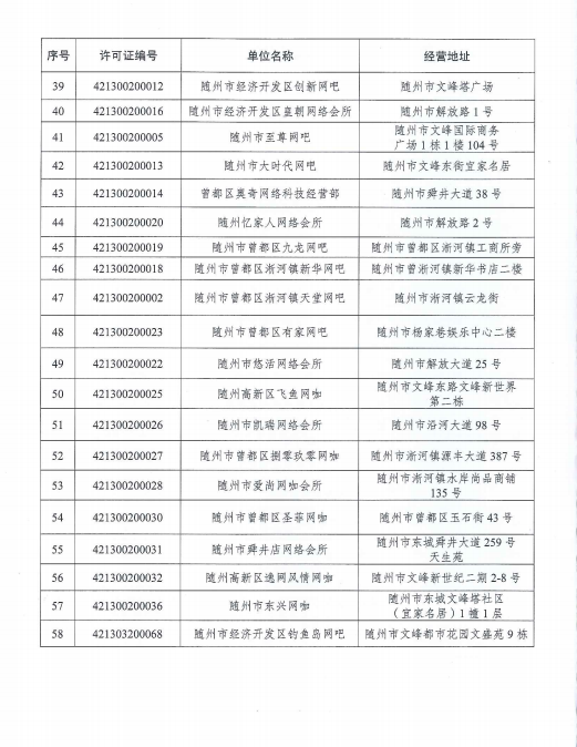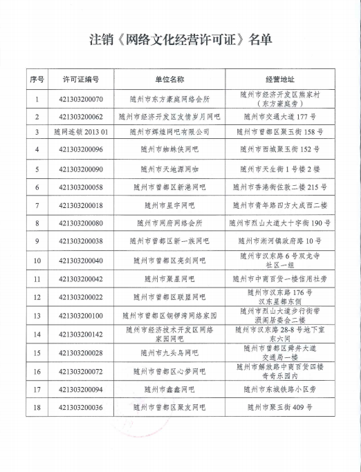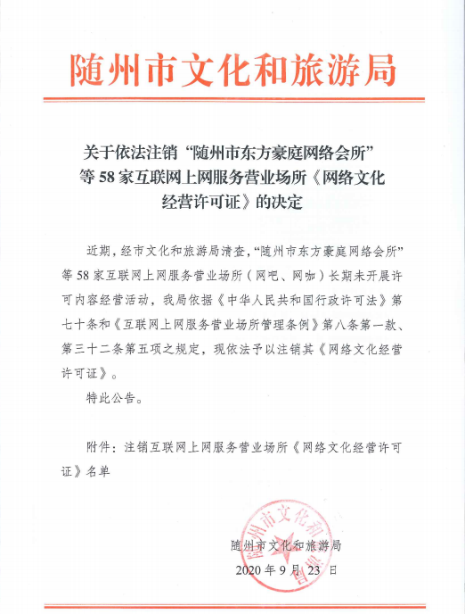 關(guān)于依法注銷“隨州市東方豪庭網(wǎng)絡(luò)會所”等58家互聯(lián)網(wǎng)上網(wǎng)服務(wù)營業(yè)場所《網(wǎng)絡(luò)文化經(jīng)營許可證》的決定