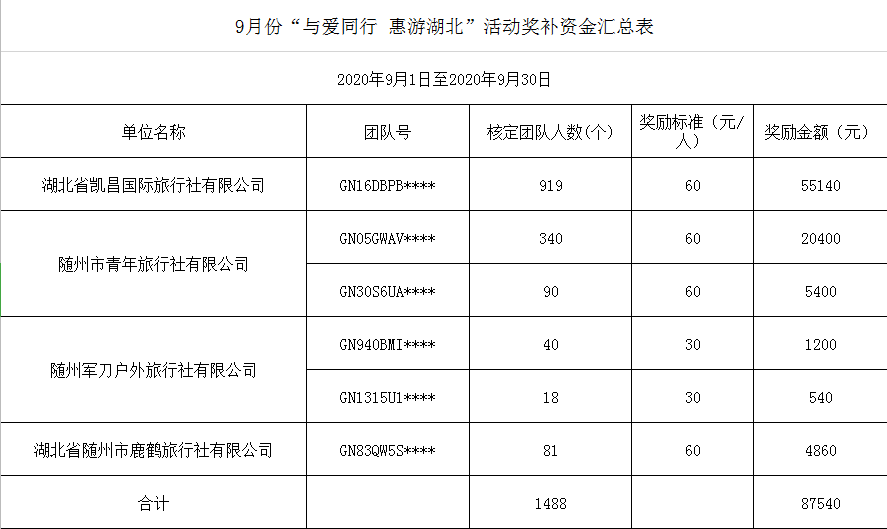 關于“與愛同行 惠游湖北” 9月份在隨申報旅行社獎補審核情況公示