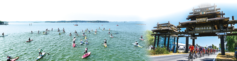 槳板賽“槳?jiǎng)硬ü饫铩⑷嗽谒闲小?br/>自行車(chē)聯(lián)賽選手騎行銀杏谷度假區(qū)
