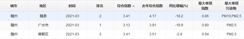 2021年1-3月,隨州市空氣監測數據:可吸入顆粒物(PM10)平均濃度值為83μg/m3,較去年同期升高20.3%;細顆粒物(PM2.5)平均濃度值為52μg/m3,較去年同期升高6.1%;二氧化硫(SO2)平均濃度值為8μg/m3,較去年同期升高60.0%;二氧化氮(NO2)平均濃度值為26μg/m3,較去年同期升高52.9%;一氧化碳(CO)第90百分位值為1.3mg/m3,較去年同期降低7.1%;臭氧(O3)8小時最大值日第95百分位值為111μg/m3,較去年同期降低6.7%。