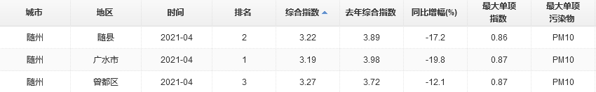2021年1-4月,隨州市空氣監測數據:可吸入顆粒物(PM10)平均濃度值為74μg/m3,較去年同期升高10.4%;細顆粒物(PM2.5)平均濃度值為45μg/m3,較去年同期無變化;二氧化硫(SO2)平均濃度值為8μg/m3,較去年同期升高60.0%;二氧化氮(NO2)平均濃度值為25μg/m3,較去年同期升高35.9%;一氧化碳(CO)第90百分位值為1.2mg/m3,較去年同期降低7.7%;臭氧(O3)8小時最大值日第95百分位值為118μg/m3,較去年同期降低15.1%。