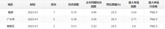 2023年1月,隨州市空氣監測數據:可吸入顆粒物(PM10)平均濃度值為127μg/m3,較去年同期升高35.1%;細顆粒物(PM2.5)平均濃度值為98μg/m3,較去年同期升高27.3%;二氧化硫(SO2)平均濃度值為8μg/m3,較去年同期無變化;二氧化氮(NO2)平均濃度值為28μg/m3,較去年同期升高7.7%;一氧化碳(CO)第95百分位值為1.4mg/m3,較去年同期無變化;臭氧(O3)8小時最大值日第90百分位值為116μg/m3,較去年同期升高28.9%。
