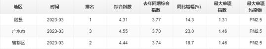 20233月,隨州市空氣監測數據:可吸入顆粒物(PM10)平均濃度值為84μg/m3,較去年同期升高33.3%;細顆粒物(PM2.5)平均濃度值為51μg/m3,較去年同期升高50.0%;二氧化硫(SO2)平均濃度值為8μg/m3,較去年同期降低11.1%;二氧化氮(NO2)平均濃度值為20μg/m3,較去年同期降低9.1%;一氧化碳(CO)第95百分位值為1.0mg/m3,較去年同期降低9.1%;臭氧(O38小時最大值日第90百分位值為144μg/m3,較去年同期降低1.4%