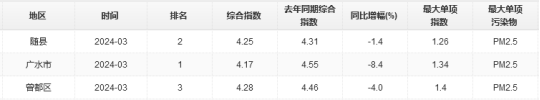 2024年3月,隨州市空氣監測數據:可吸入顆粒物(PM10)平均濃度值為81μg/m3,較去年同期降低2.4%;細顆粒物(PM2.5)平均濃度值為49μg/m3,較去年同期降低5.8%;二氧化硫(SO2)平均濃度值為9μg/m3,較去年同期升高12.5%;二氧化氮(NO2)平均濃度值為20μg/m3,較去年同期無變化;一氧化碳(CO)第95百分位值為0.9mg/m3,較去年同期降低10.0%;臭氧(O3)8小時最大值日第90百分位值為134μg/m3,較去年同期降低6.9%。