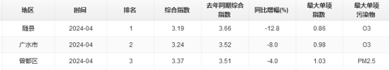 2024年4月,隨州市空氣監(jiān)測(cè)數(shù)據(jù):可吸入顆粒物(PM10)平均濃度值為52μg/m3,較去年同期降低16.1%;細(xì)顆粒物(PM2.5)平均濃度值為36μg/m3,較去年同期升高9.1%;二氧化硫(SO2)平均濃度值為8μg/m3,較去年同期無(wú)變化;二氧化氮(NO2)平均濃度值為15μg/m3,較去年同期升高7.1%;一氧化碳(CO)第95百分位值為0.9mg/m3,較去年同期無(wú)變化;臭氧(O3)8小時(shí)最大值日第90百分位值為139μg/m3,較去年同期降低11.5%。