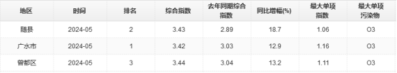20245月,隨州市空氣監測數據:可吸入顆粒物(PM10)平均濃度值為51μg/m3,較去年同期升高10.9%;細顆粒物(PM2.5)平均濃度值為34μg/m3,較去年同期升高13.3%;二氧化硫(SO2)平均濃度值為8μg/m3,較去年同期升高33.3%;二氧化氮(NO2)平均濃度值為11μg/m3,較去年同期無變化;一氧化碳(CO)第95百分位值為0.9mg/m3,較去年同期升高28.6%;臭氧(O38小時最大值日第90百分位值為178μg/m3,較去年同期升高16.3%