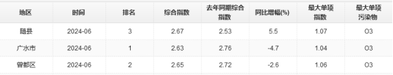 20241-6月,隨州市空氣監測數據:可吸入顆粒物(PM10)平均濃度值為64μg/m3,較去年同期降低9.9%;細顆粒物(PM2.5)平均濃度值為45μg/m3,較去年同期降低10.0%;二氧化硫(SO2)平均濃度值為8μg/m3,較去年同期升高14.3%;二氧化氮(NO2)平均濃度值為16μg/m3,較去年同期降低11.1%;一氧化碳(CO)第95百分位值為1.0mg/m3,較去年同期降低16.7%;臭氧(O38小時最大值日第90百分位值為156μg/m3,較去年同期升高7.6%
