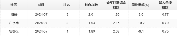 20247月,隨州市空氣監測數據:可吸入顆粒物(PM10)平均濃度值為22μg/m3,較去年同期降低21.4%;細顆粒物(PM2.5)平均濃度值為15μg/m3,較去年同期降低16.7%;二氧化硫(SO2)平均濃度值為6μg/m3,較去年同期無變化;二氧化氮(NO2)平均濃度值為4μg/m3,較去年同期降低33.3%;一氧化碳(CO)第95百分位值為0.8mg/m3,較去年同期升高14.3%;臭氧(O38小時最大值日第90百分位值為120μg/m3,較去年同期升高1.8%