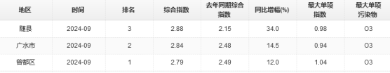 2024年1-9月,隨州市空氣監(jiān)測(cè)數(shù)據(jù):可吸入顆粒物(PM10)平均濃度值為51μg/m3,較去年同期降低8.9%;細(xì)顆粒物(PM2.5)平均濃度值為36μg/m3,較去年同期降低7.7%;二氧化硫(SO2)平均濃度值為7μg/m3,較去年同期無(wú)變化;二氧化氮(NO2)平均濃度值為13μg/m3,較去年同期降低13.3%;一氧化碳(CO)第95百分位值為1.0mg/m3,較去年同期降低9.1%;臭氧(O3)8小時(shí)最大值日第90百分位值為153μg/m3,較去年同期升高4.8%。