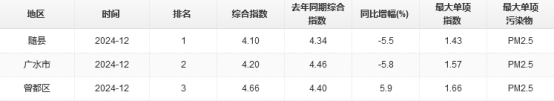 20241-12月,隨州市空氣監測數據:可吸入顆粒物(PM10)平均濃度值為54μg/m3,較去年同期降低8.5%;細顆粒物(PM2.5)平均濃度值為39μg/m3,較去年同期降低4.9%;二氧化硫(SO2)平均濃度值為8μg/m3,較去年同期升高14.3%;二氧化氮(NO2)平均濃度值為16μg/m3,較去年同期降低11.1%;一氧化碳(CO)第95百分位值為1.0mg/m3,較去年同期降低9.1%;臭氧(O38小時最大值日第90百分位值為146μg/m3,較去年同期升高0.7%。