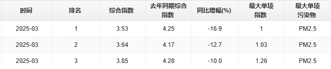 2025年3月,達標天數(shù)28天(優(yōu)4天,良25天)占比例為93.5%,較去年同期升高6.4%;輕度污染2天、中度污染0天、重度污染0天、嚴重污染0天。