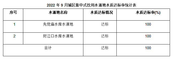 2022年9月,隨州市城區集中式飲用水源地水質達標率為100%。水質達標統計見下表: