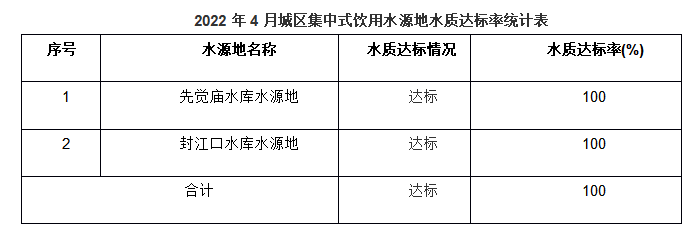 2022年4月,隨州市城區(qū)集中式飲用水源地水質(zhì)達(dá)標(biāo)率為100%。水質(zhì)達(dá)標(biāo)統(tǒng)計(jì)見下表: