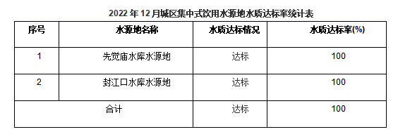 2022年12月,隨州市城區(qū)集中式飲用水源地水質(zhì)達(dá)標(biāo)率為100%。水質(zhì)達(dá)標(biāo)統(tǒng)計(jì)見(jiàn)下表:
